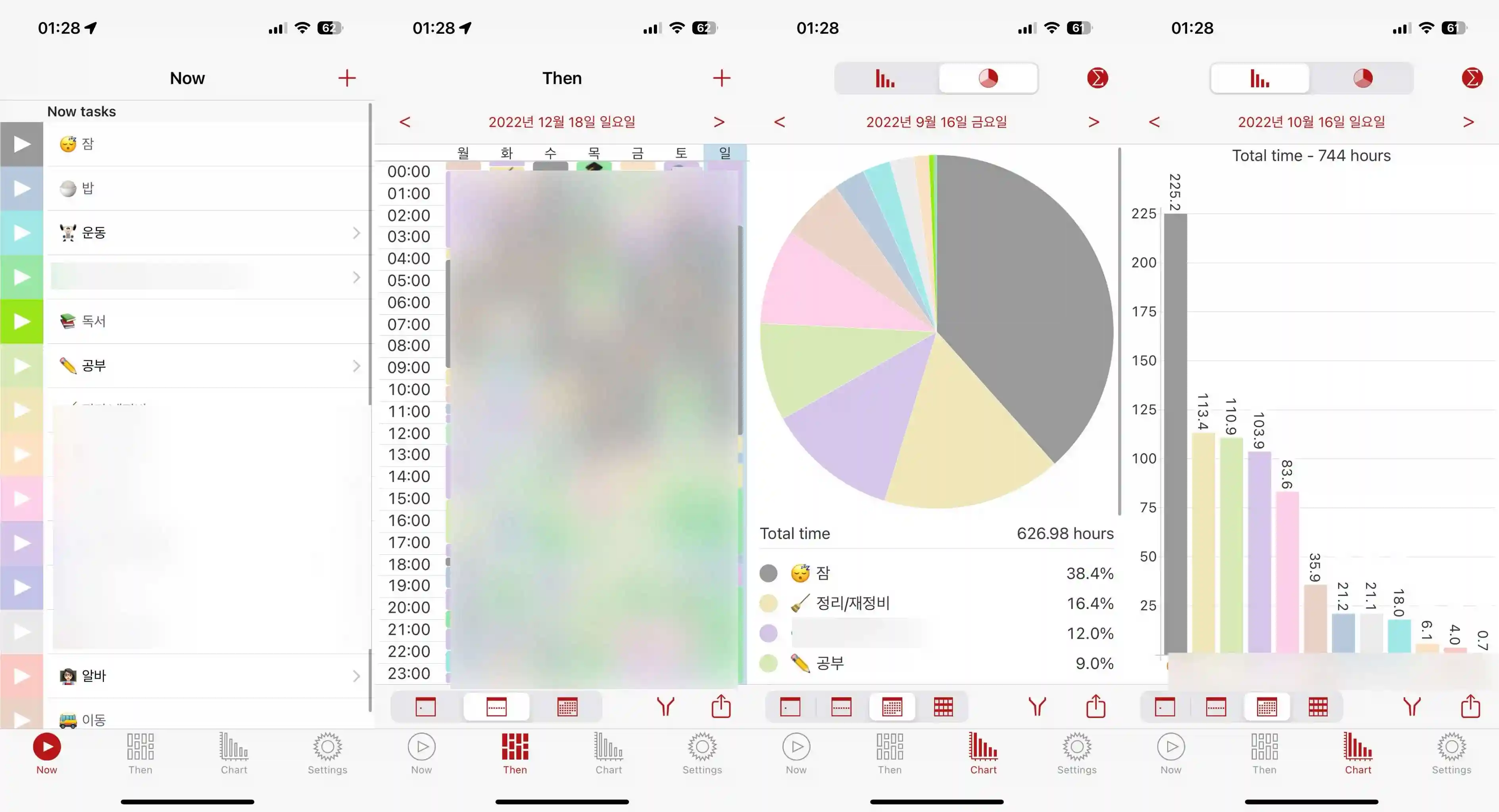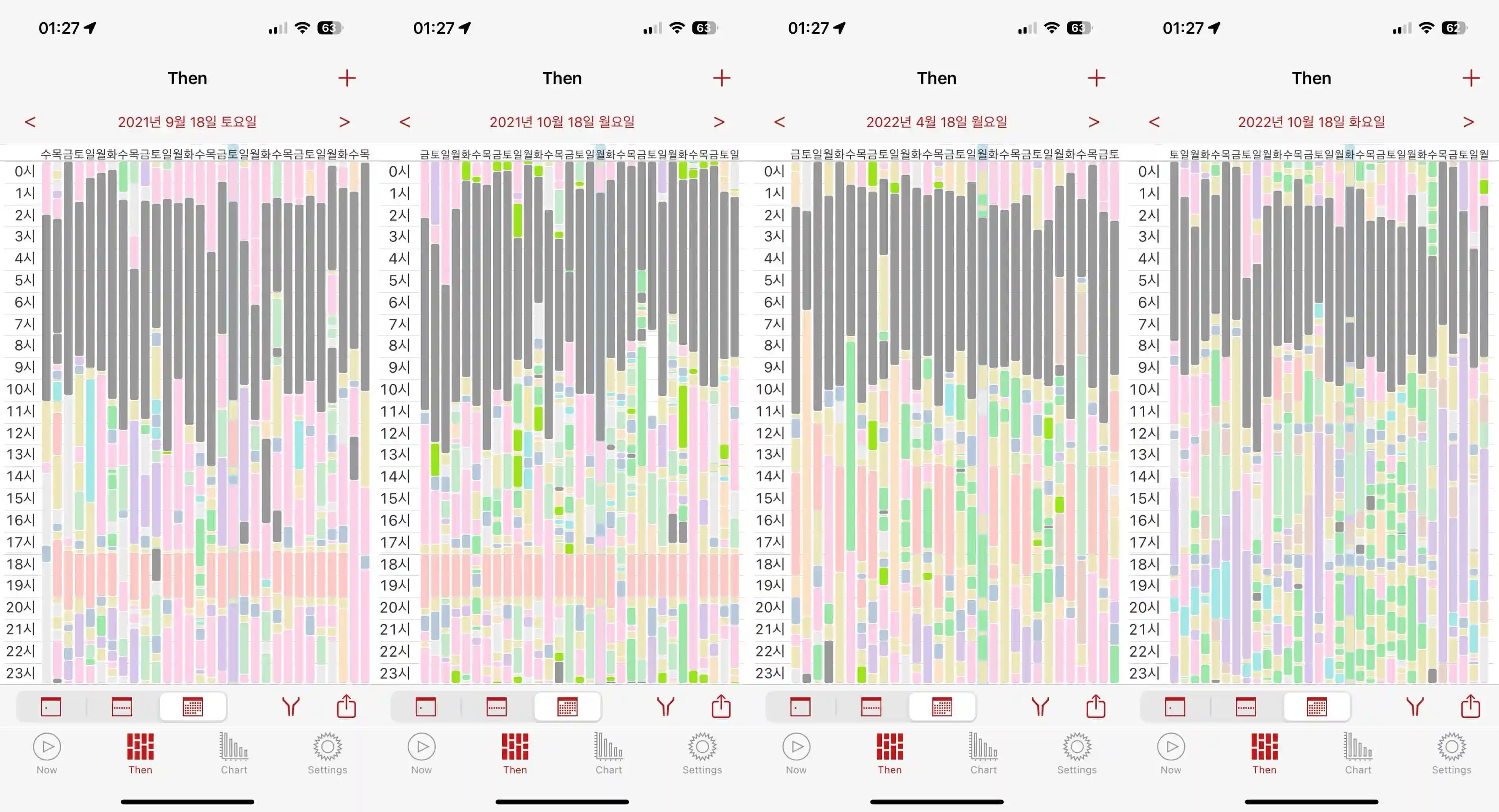 그리고 이 앱을 21년 9월부터 쓰게 되었는데 점점 초록색(공부/독서) 시간 많아지는게 보이시죠.