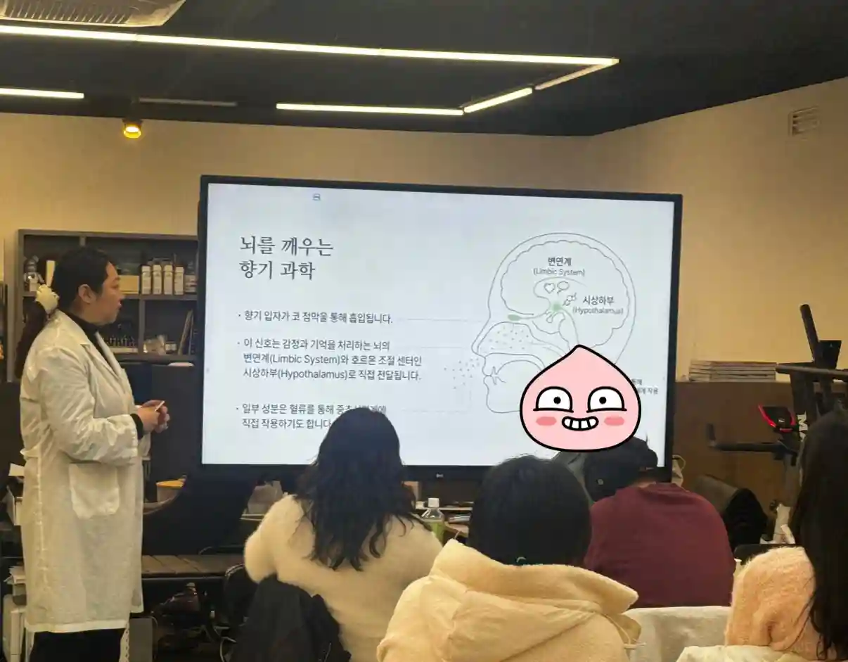 특정 향기 분자가 코를 통해 뇌의 감정 중추(편도체,시상하하부)에 직접 신호를 보내자, 애쓰지 않아도 과열된 머리가 식기 시작했습니다.