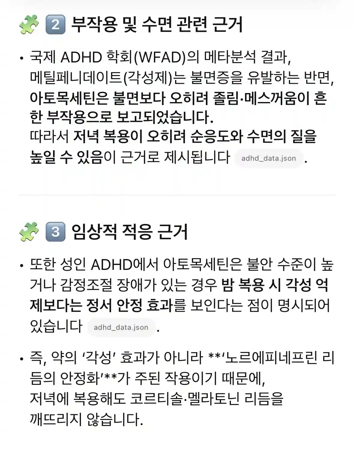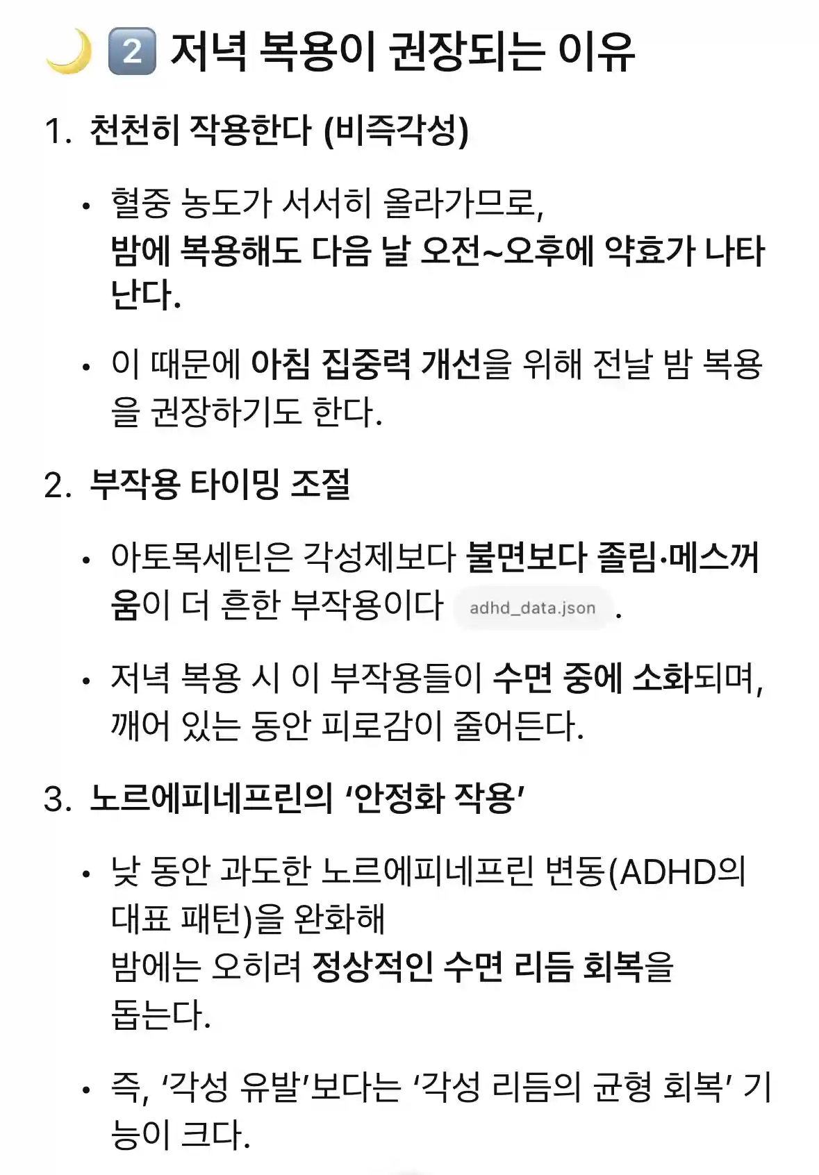 질문 아토목세틴은 각성제가 아니다 suha 2025.10.19 추천 1 조회수 749 댓글 1 공유 제가 보유한 ADHD 데이터를 학습한 AI 기반으로 답변드립니다 목록으로 저장 공유 추천 댓글 1 니카오 게시글 쪽지 보내기 와.. 성분에 대한 엄청난 지식이 있으시네요 자는 콘서타 메디키넷 등 먹는 약밖에 모르는데; 2025.11.08 답글 추천 0 답글 작성 고민·질문 성인 ADHD 동지들에게 궁금한 점과 고민상담을 자유롭게 나눠주세요 전체 질문 고민 번호 제목 작성자 날짜 조회수 1221 질문 논점이탈을 고치고 싶어요 +2 루지 2025.12.27 조회 1178 루지 2025.12.27 1178 1197 질문 명상을 어떻게 하시나요? +1 참새 2025.12.06 조회 1471 참새 2025.12.06 1471 1178 질문 어릴때 잘때 맨날 우셨던 분 있으신가요? +3 망고빙수 2025.11.23 조회 1158 망고빙수 2025.11.23 1158 1173 질문 땀이 너무 나요. 😭 땀나는 부작용 극복이되나요? +6 요그 2025.11.23 조회 705 요그 2025.11.23 705 1172 질문 보통 일어나서 침대에서 나오기까지 얼마나 걸리세요? +4 루지 2025.11.23 조회 554 루지 2025.11.23 554 1170 질문 약 부작용 기록 어플 추천해주세요! +3 루지 2025.11.22 조회 1262 루지 2025.11.22 1262 1148 질문 갑상선 질환 있으신분 중에 adhd 약물복용 +2 현명 2025.11.12 조회 1151 현명 2025.11.12 1151 1139 질문 해외에서 치료중이신 분 중 +1 Dex 2025.11.11 조회 1417 Dex 2025.11.11 1417 1125 질문 잠에 들기가 어려우신 분 있나요? +2 니카오 2025.11.08 조회 1392 니카오 2025.11.08 1392 1102 질문 다들 시간관리, 할일관리, 단기기억 어떻게 관리하시나요 +2 짱짱 2025.10.30 조회 1100 짱짱 2025.10.30 1100 1097 질문 수험생 adhd 부주의형 계속 공부하는법 +2 똑순이 2025.10.28 조회 1134 똑순이 2025.10.28 1134 1089 질문 휴일에도 데일리페이지나 하루 계획 하시나요? +4 wntr 2025.10.24 조회 1607 wntr 2025.10.24 1607 1076 질문 할일을 넣는 기준이 있으신가요? +3 부우 2025.10.19 조회 981 부우 2025.10.19 981 1073 질문 노르에피네프린 효과 +4 차코르 2025.10.19 조회 763 차코르 2025.10.19 763 1074 질문 ㄴ (답글) 아토목세틴은 각성제가 아니다 +1 suha 2025.10.19 조회 749 suha 2025.10.19 749 1065 질문 다들 추천하는 자기계발 / 시간관리 어플리케이션 있을까요? +7 봉봉 2025.10.16 조회 820 봉봉 2025.10.16 820 제목+내용 제목 내용 작성자 제목+내용+댓글 검색 1 2 3 4 5